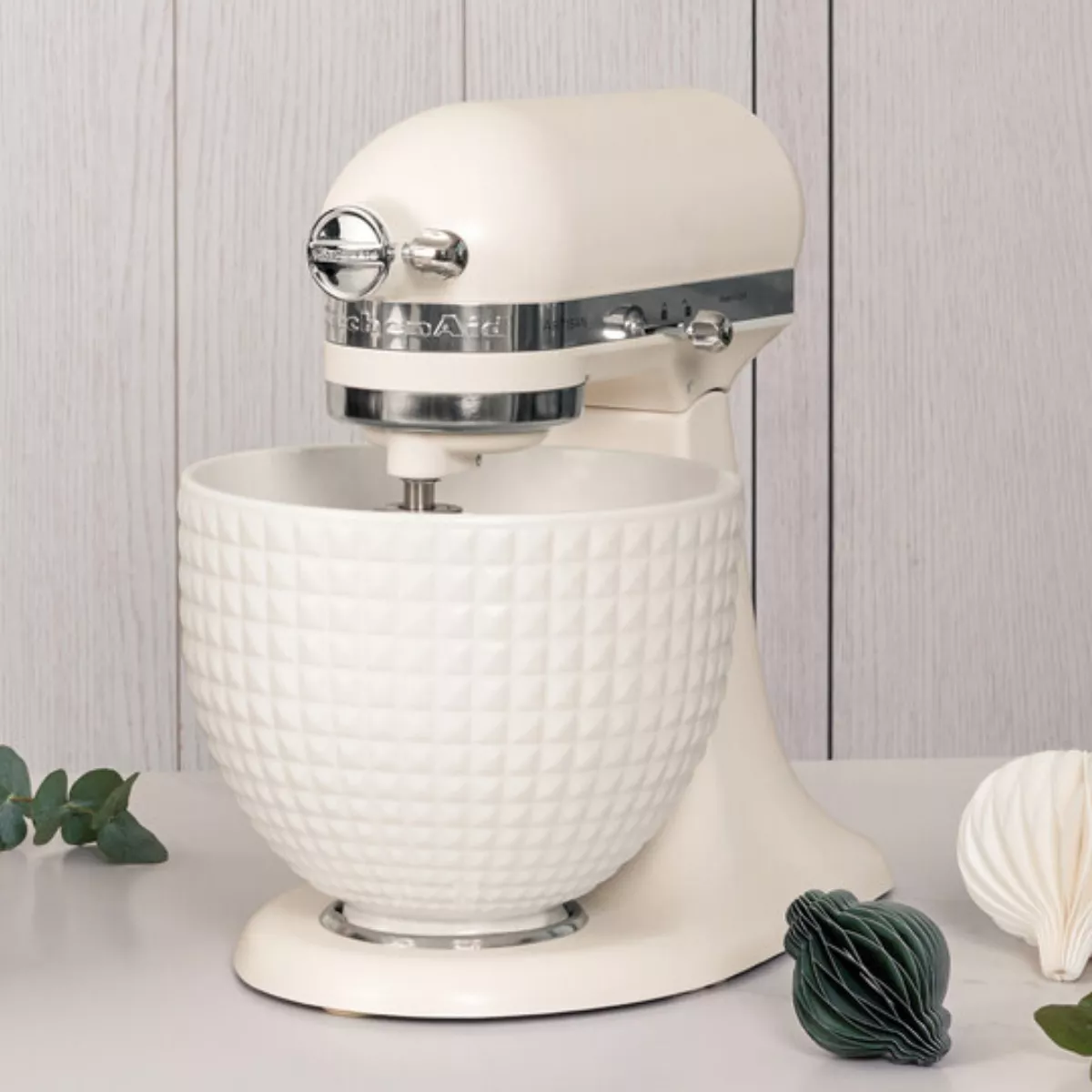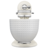 A porcelánfehér robotgép és a fehér, szegecsekkel díszített tál nyugodt tisztaságot mutat és megbízható teljesítményt nyújt – ez a párosítás illeszkedik bármely konyhába, miközben minden keverésnél, dagasztásnál pontos, megbízható eredményt biztosít.